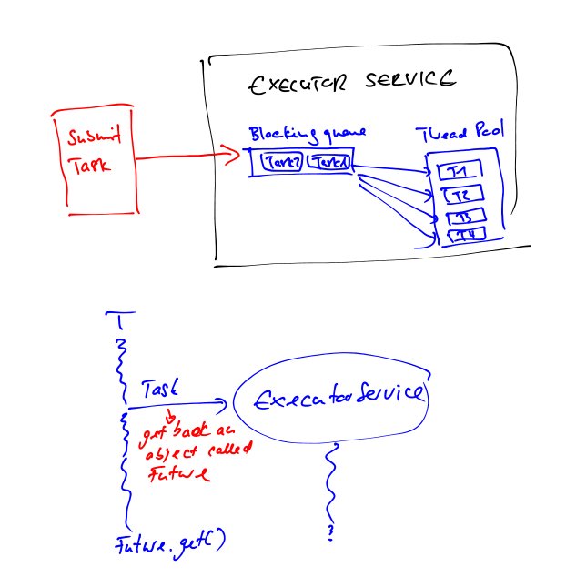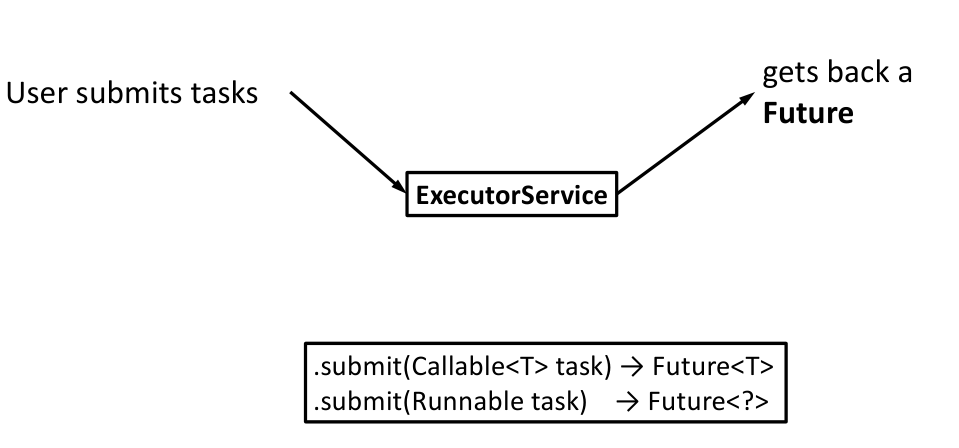 submit(Callable<T> task): Submits a task that returns a result (of typeT). Returns aFuture<T>object.submit(Runnable task): Submits a task that doesn’t return a result. Returns aFuture<?>object.Future: It represents a submission of a task. The user submits a task to theExecutorService.