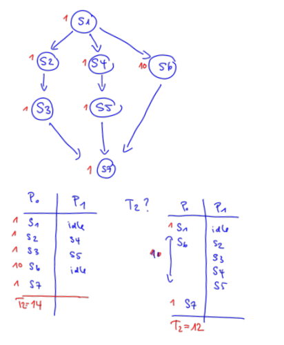 - (Span/Critical Path): Time to execute on an infinite number of processors. Length of the longest path (critical path) in the DAG.