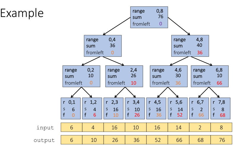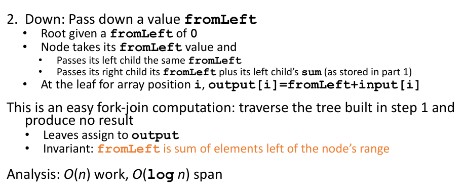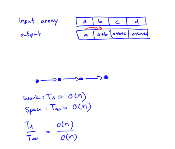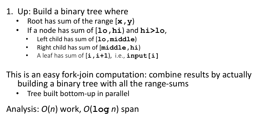 Surprisingly, there’s a clever parallel algorithm for prefix-sum that achieves work and span. It uses a divide-and-conquer approach with two passes: