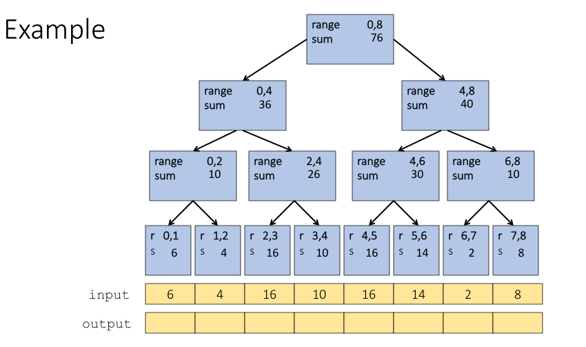 Up Pass (Build Tree): We build a binary tree bottom-up. Each node in the tree stores the sum of a range of elements in the input array.