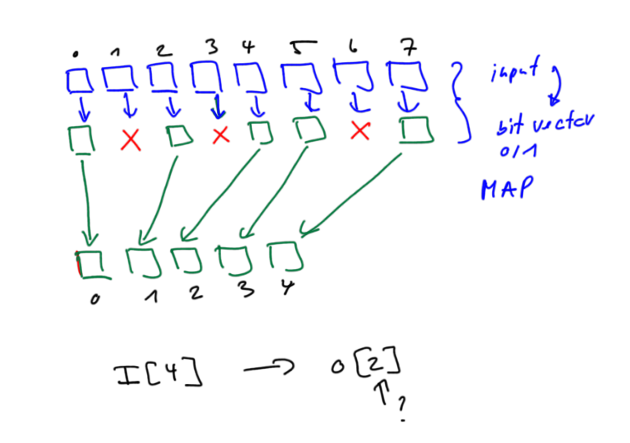 Map (Output): Create the output array. For each element in the input array, if its corresponding bit in the bit vector is 1, copy the element to the output array at the index indicated by the