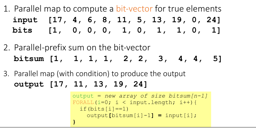 bitsumarray (minus 1, because of 0-based indexing).output = new array of size bitsum[n-1] FORALL(i=0; i < input.length; i++){ if(bits[i]==1) output[bitsum[i]-1] = input[i]; }