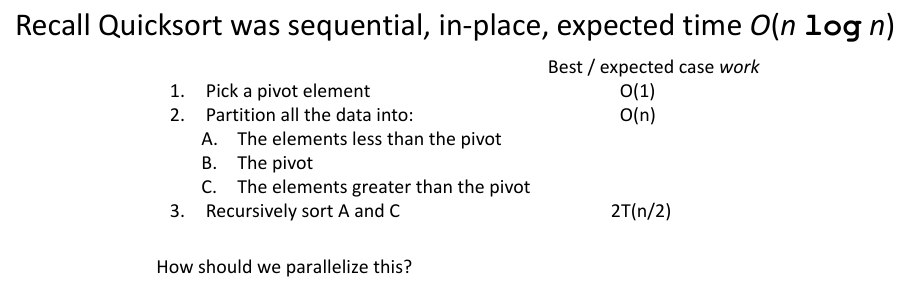 Finally, let’s revisit Quicksort and see how we can parallelize it. Recall the basic steps of Quicksort: