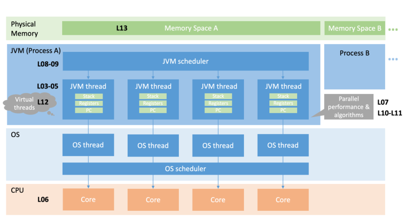 Let’s keep the overall system architecture in mind: physical memory, processes (like the JVM), threads (JVM and OS), schedulers, and CPU cores. Our goal now is to understand how threads within the same process can safely interact when they access the same data in memory.