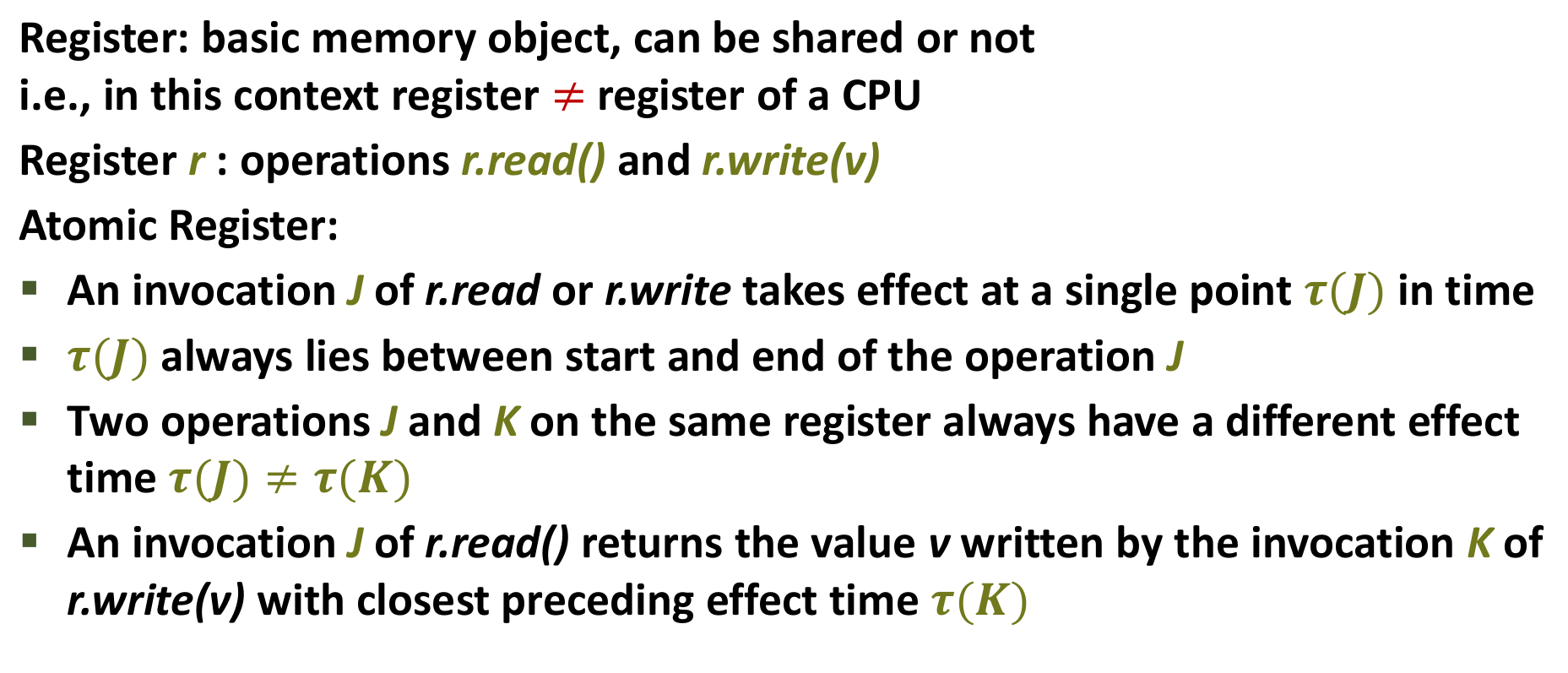 We defined atomic registers where read/write operations appear to take effect at a single point in time (τ), ensuring reads observe the value from the immediately preceding write (providing a total order). This formalism helped us prove the correctness of algorithms like Peterson’s, assuming atomic registers for shared variables.