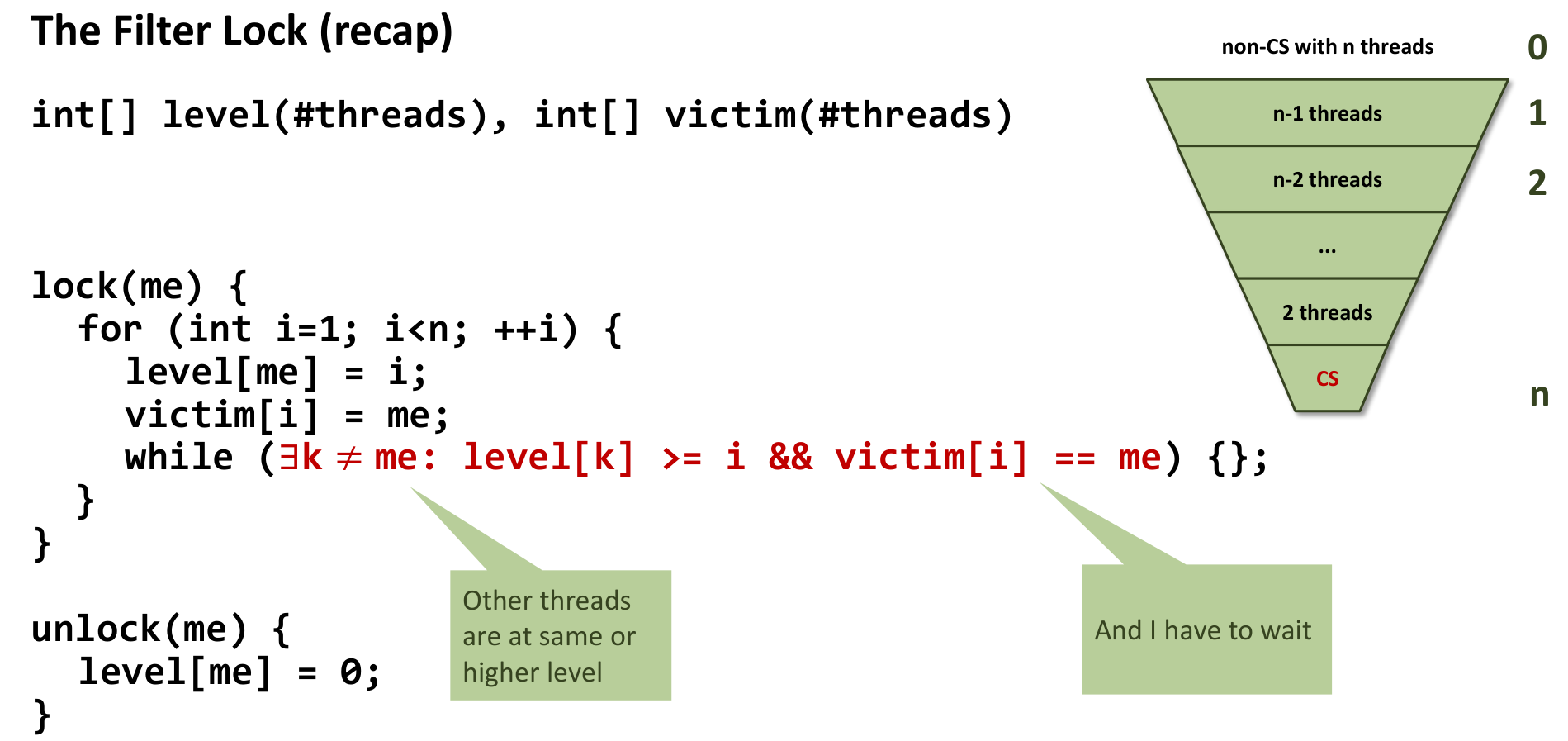 The Filter Lock extended Peterson’s idea to N processes using N-1 levels of “filters”. Threads progress through levels, and at each level, a Peterson-like victim mechanism allows at most threads to pass level i. It ensures mutual exclusion, deadlock-freedom, and starvation-freedom but is not FCFS and can be inefficient due to reading N-1 variables per level in the wait loop.