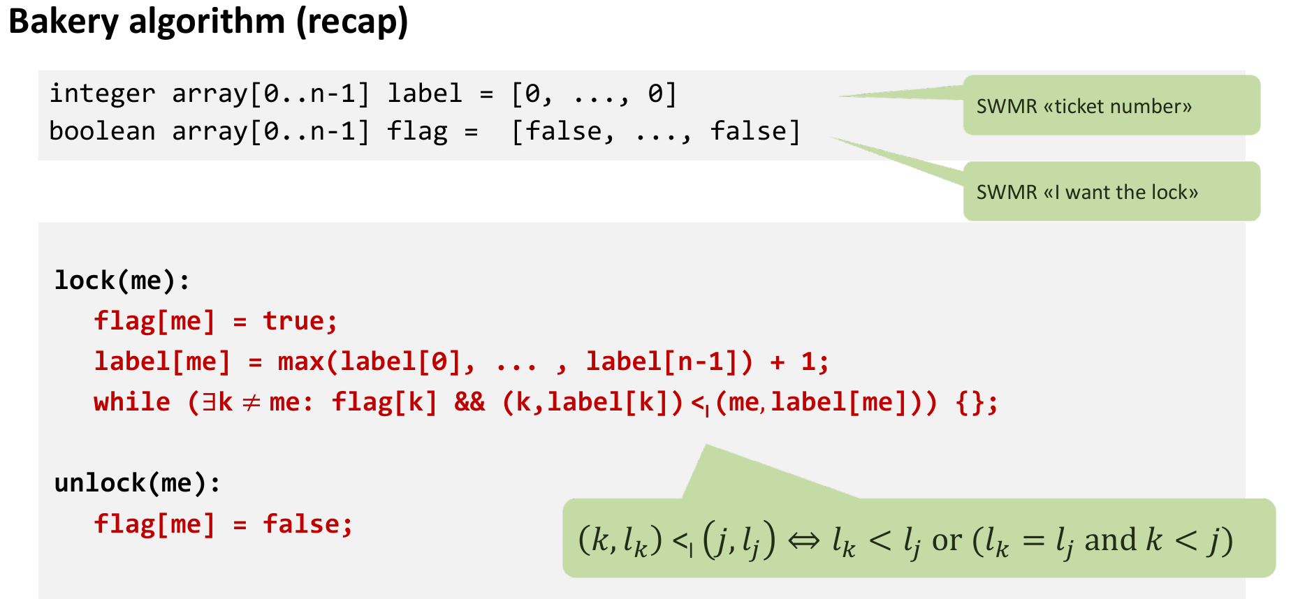 These algorithms (Filter, Bakery) demonstrate it’s possible to achieve mutual exclusion with only atomic/regular registers. However, they have practical drawbacks: