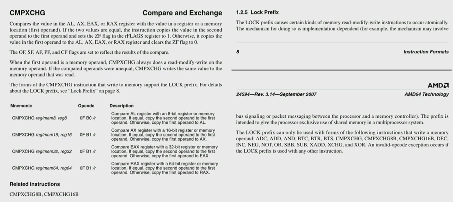 LOCKPrefix: Prepending theLOCKinstruction prefix toCMPXCHG(and certain other instructions) ensures that the entire read-modify-write sequence is performed atomically with respect to other processors, typically by locking the memory bus or using cache locking mechanisms.