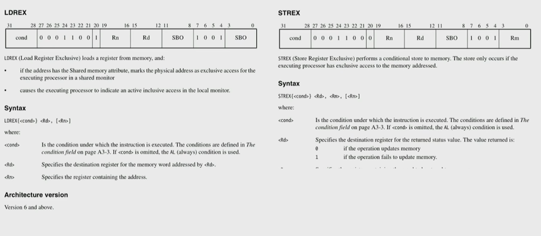 LDREX rd, [rn](Load Register Exclusive): Loads a value from memory location[rn]into registerrd. Crucially, it also “marks” the physical address as having an exclusive access pending by this processor (using a local “exclusive monitor”).STREX rd, rm, [rn](Store Register Exclusive): Attempts to store the value from registerrminto memory location[rn]. The store succeeds only if the executing processor still has exclusive access marked for that address (i.e., no other processor has written to it since theLDREX). The status of the store (success=0, failure=1) is written to registerrd.