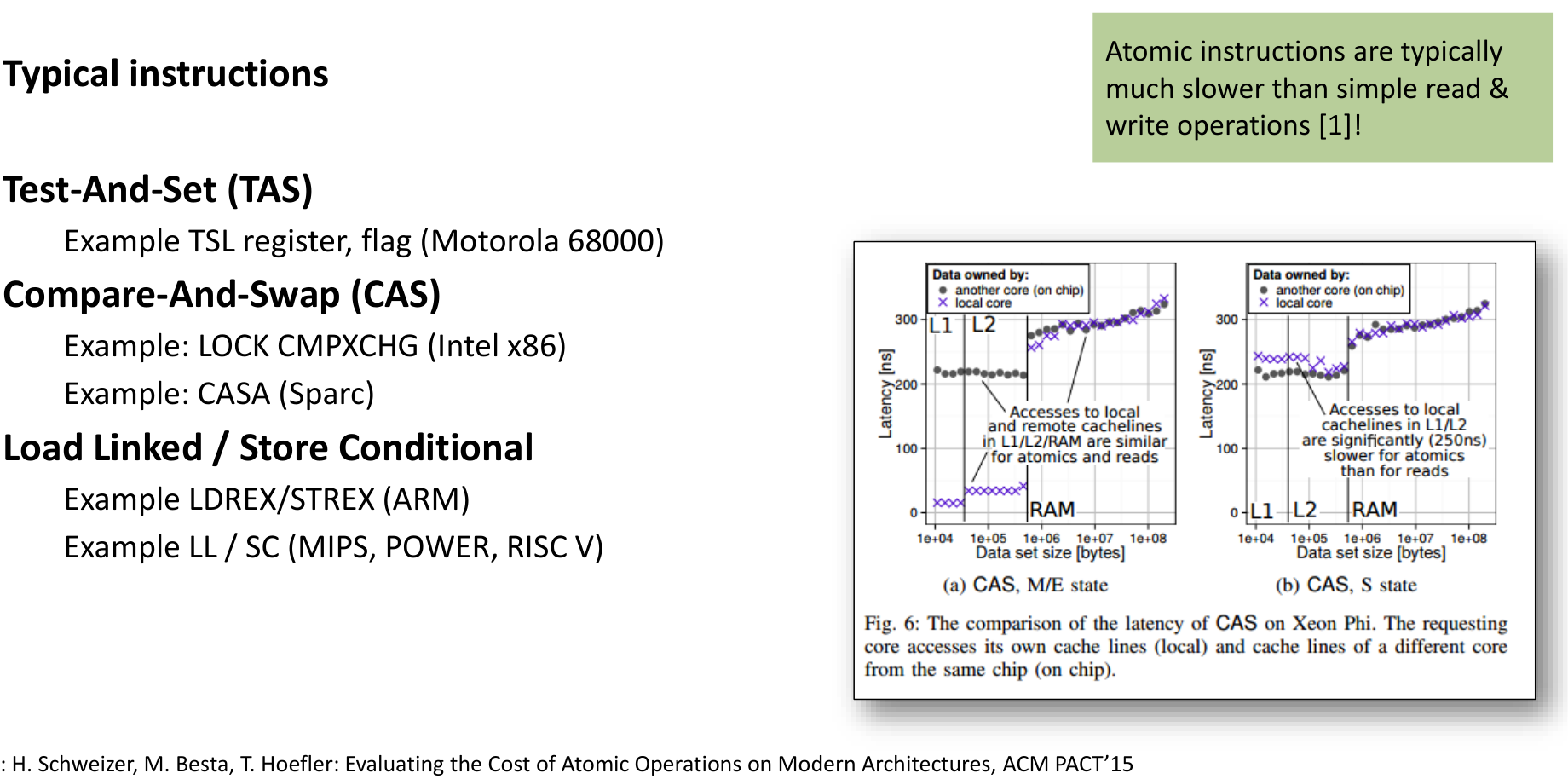 Cost: These atomic instructions are typically much slower than simple load or store operations because they often require complex cache coherence interactions or bus locking to ensure atomicity across multiple cores.