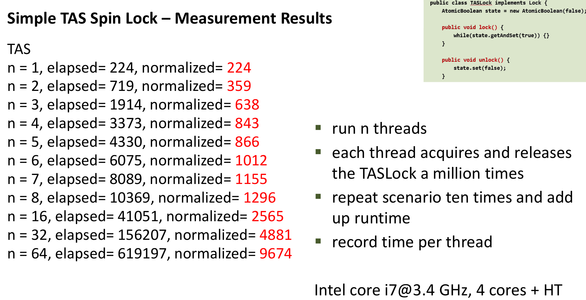 Measurements show that the runtime of this simple TAS spinlock scales poorly as the number of threads (n) increases. The normalized time per thread grows significantly.