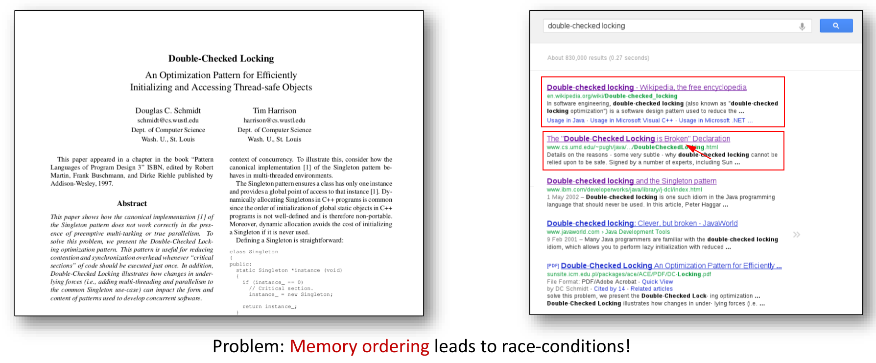 TATAS Limitation: While better, TATAS doesn’t solve all problems. For example, the infamous “Double-Checked Locking” pattern for lazy initialization often fails due to memory reordering issues, even if atomic primitives seem involved. Relying on low-level spinning reads without proper memory barriers can be unsafe.