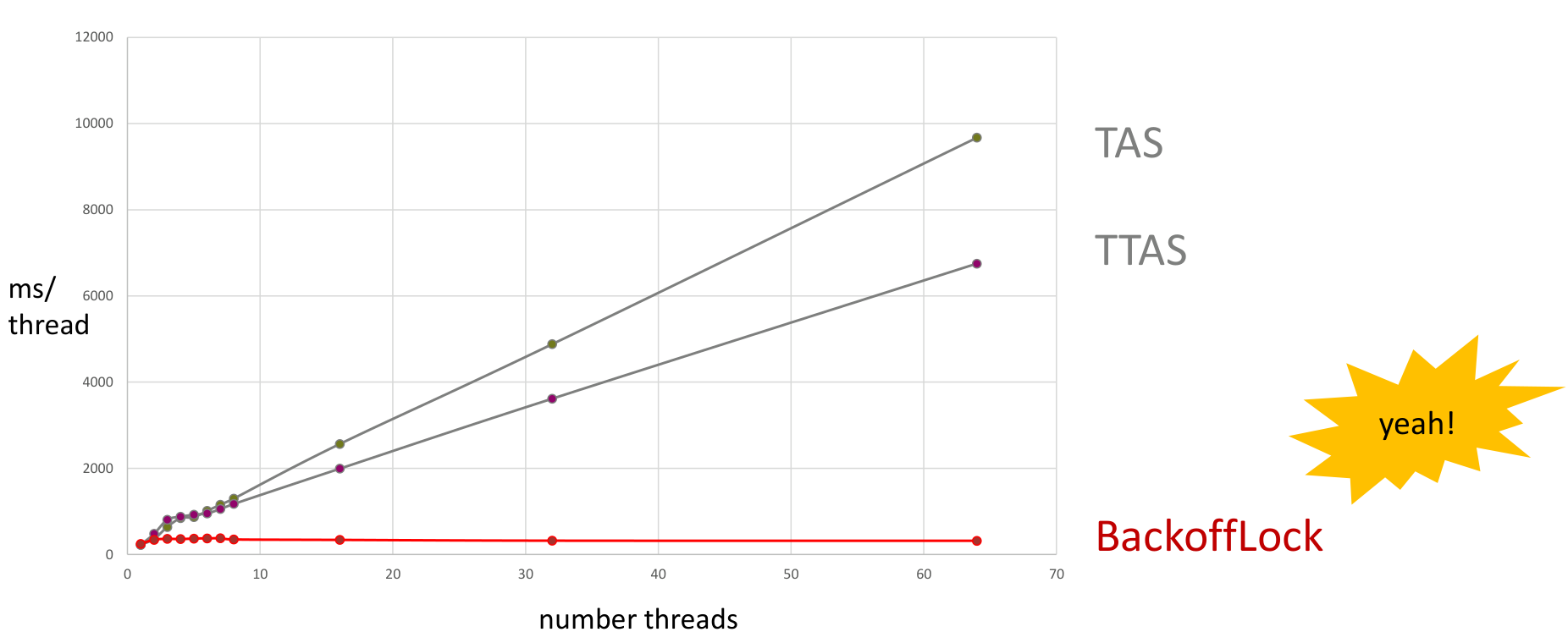 Observation: Even with TATAS, if many threads detect the lock is free around the same time, they will all execute the atomic compareAndSet or getAndSet, causing a burst of contention. This slows down overall progress.