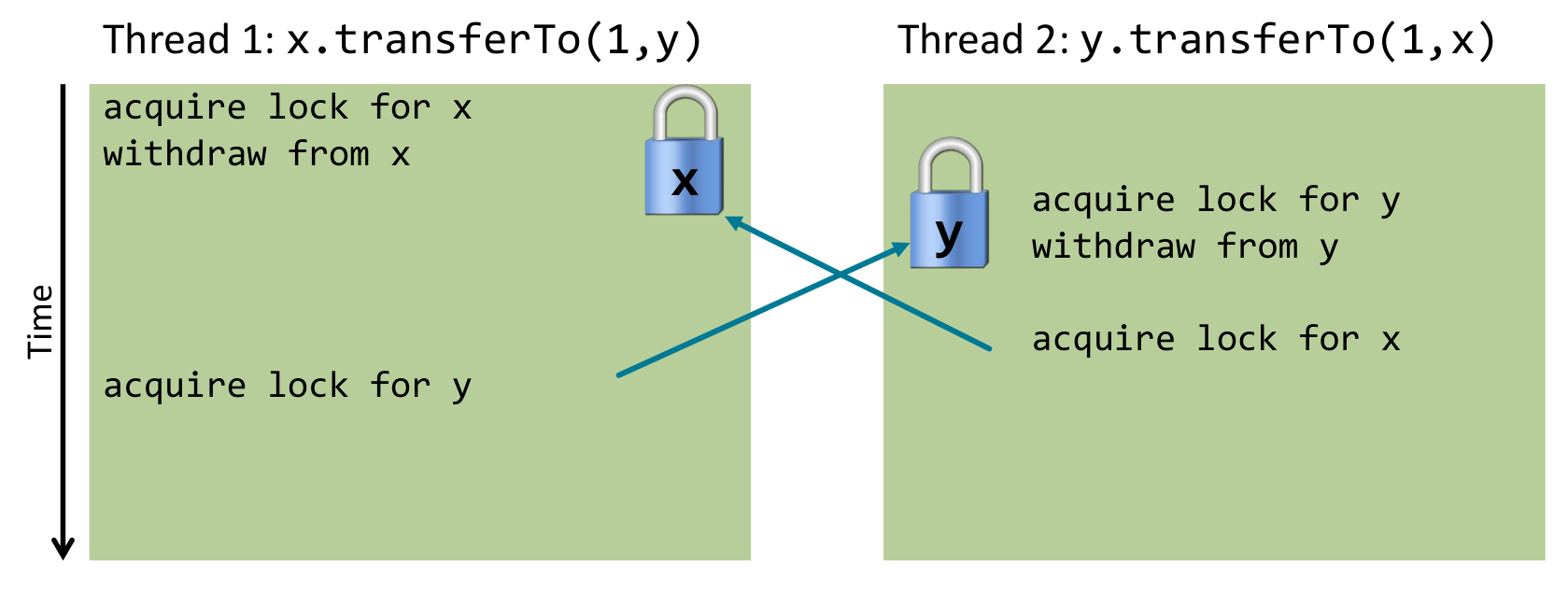 y.transferTo, acquires lock ony. - Thread 2: Executes