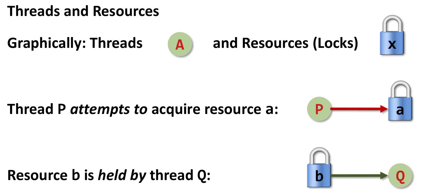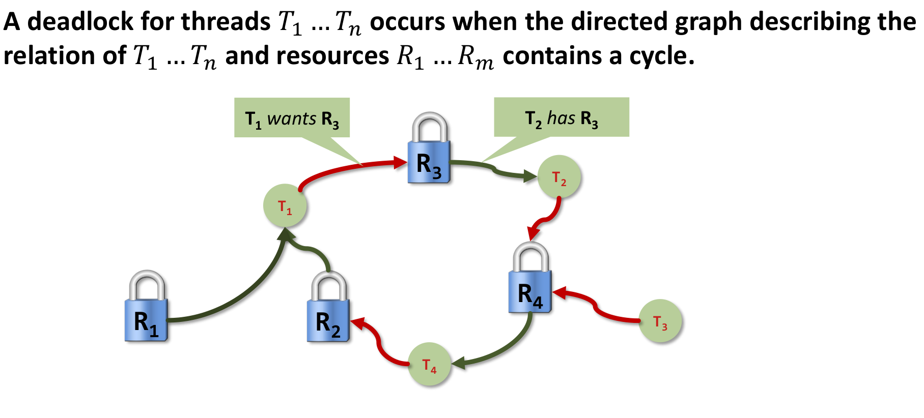 A deadlock exists if and only if the resource allocation graph (showing threads and resources , with edges for “wants” and “has”) contains a cycle.