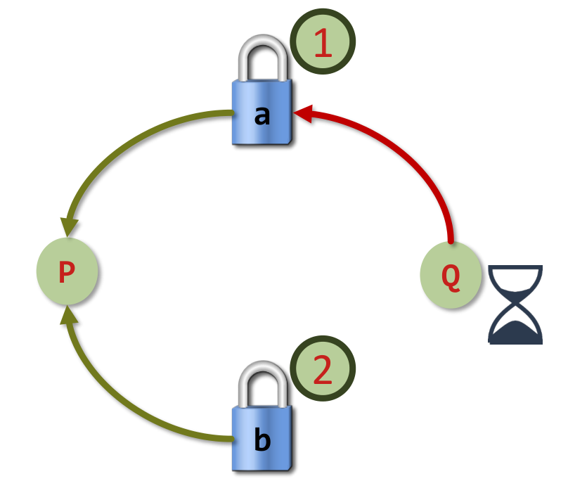 - Arrow from Resource to Thread (b → Q): Resource b is held by thread Q.
