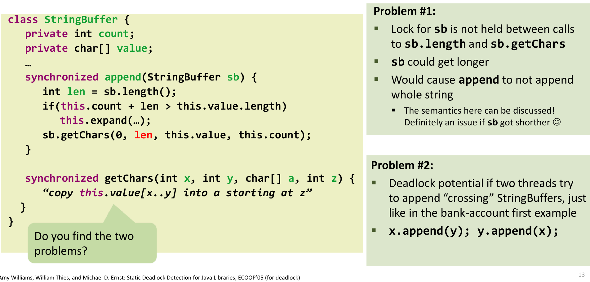 x.length()(orx.getChars()) and blocks waiting for the lock onx. Deadlock! This is the exact same pattern as the bank transfer.