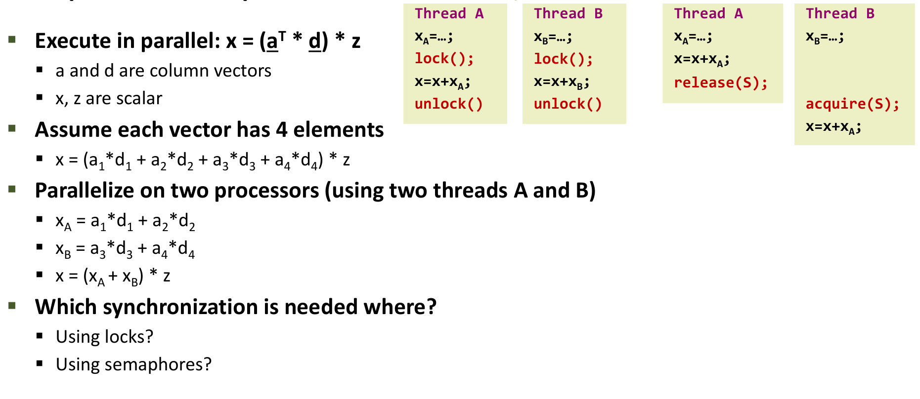 xB = ...; S.acquire(); x = x + xB;(assumingxstarts at 0 or requires mutual exclusion for the update if not atomic). Thread B waits until A releases, ensuringxA’s contribution is included before B addsxB. (Note: This simple example assumesx=x+xAis atomic or protected separately if needed.)