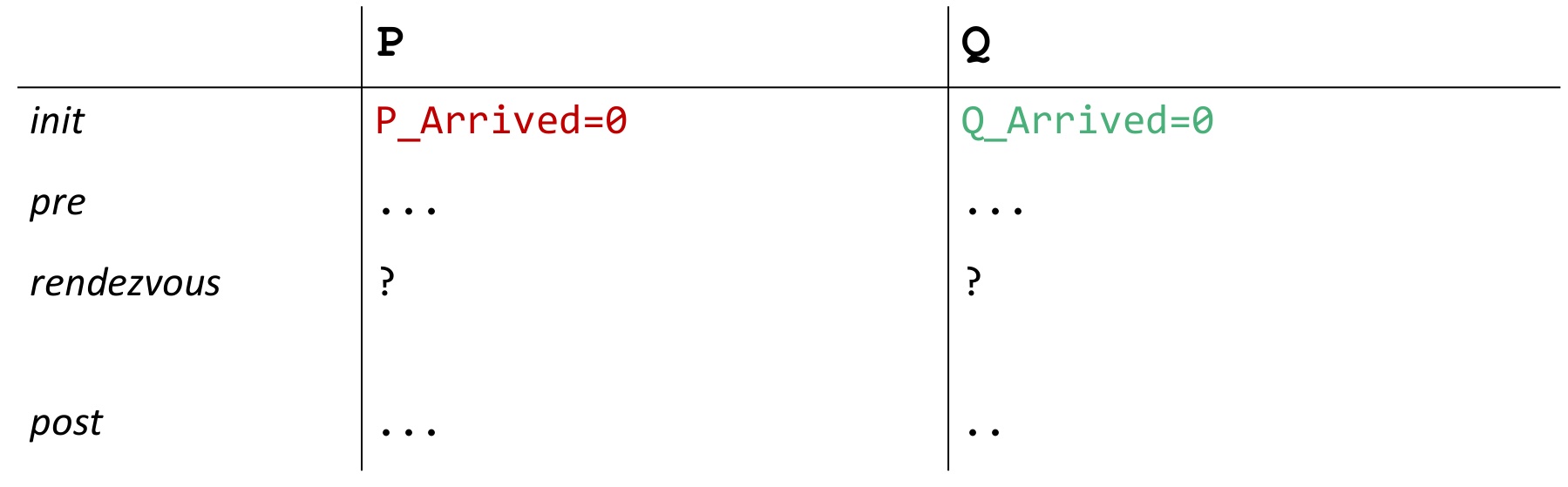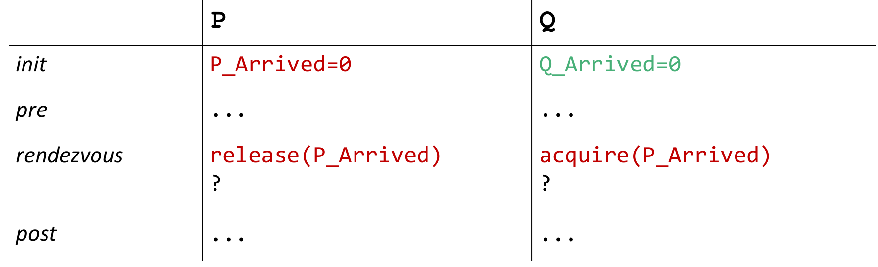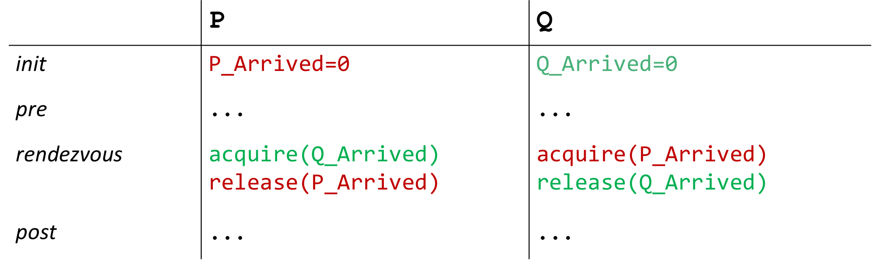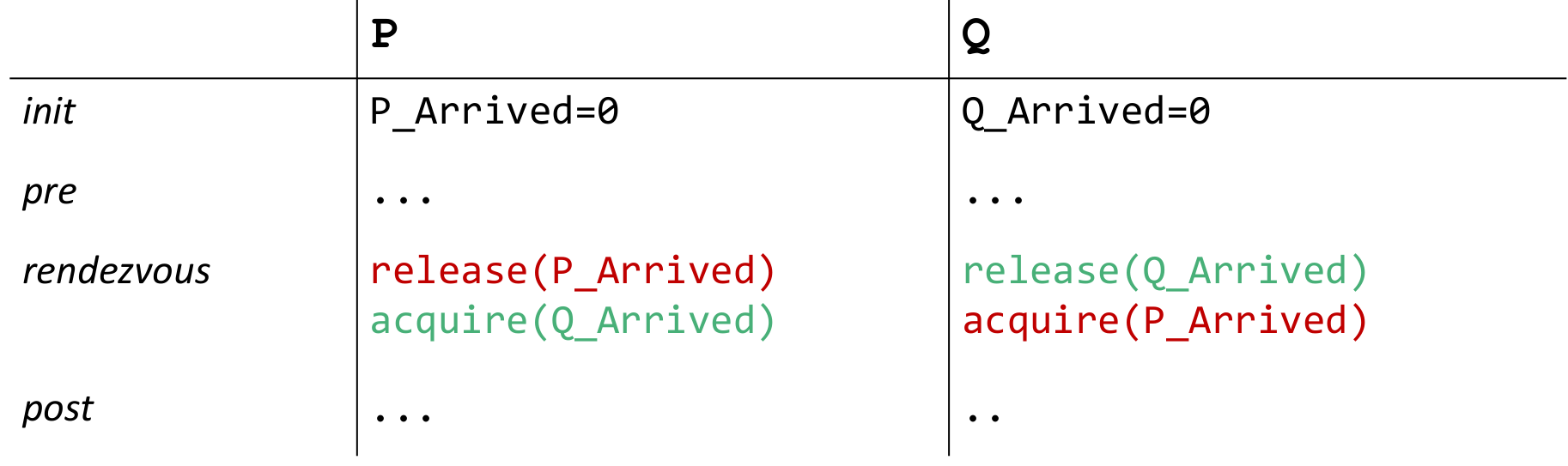 Problem: Two processes, P and Q, need to wait for each other at a specific point (rendezvous) before proceeding.