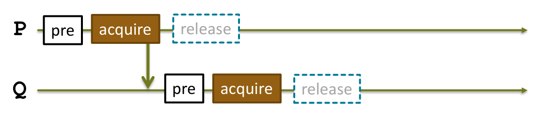 Each process first signals its own arrival (release) and then waits for the other’s signal (acquire). This avoids the deadlock.