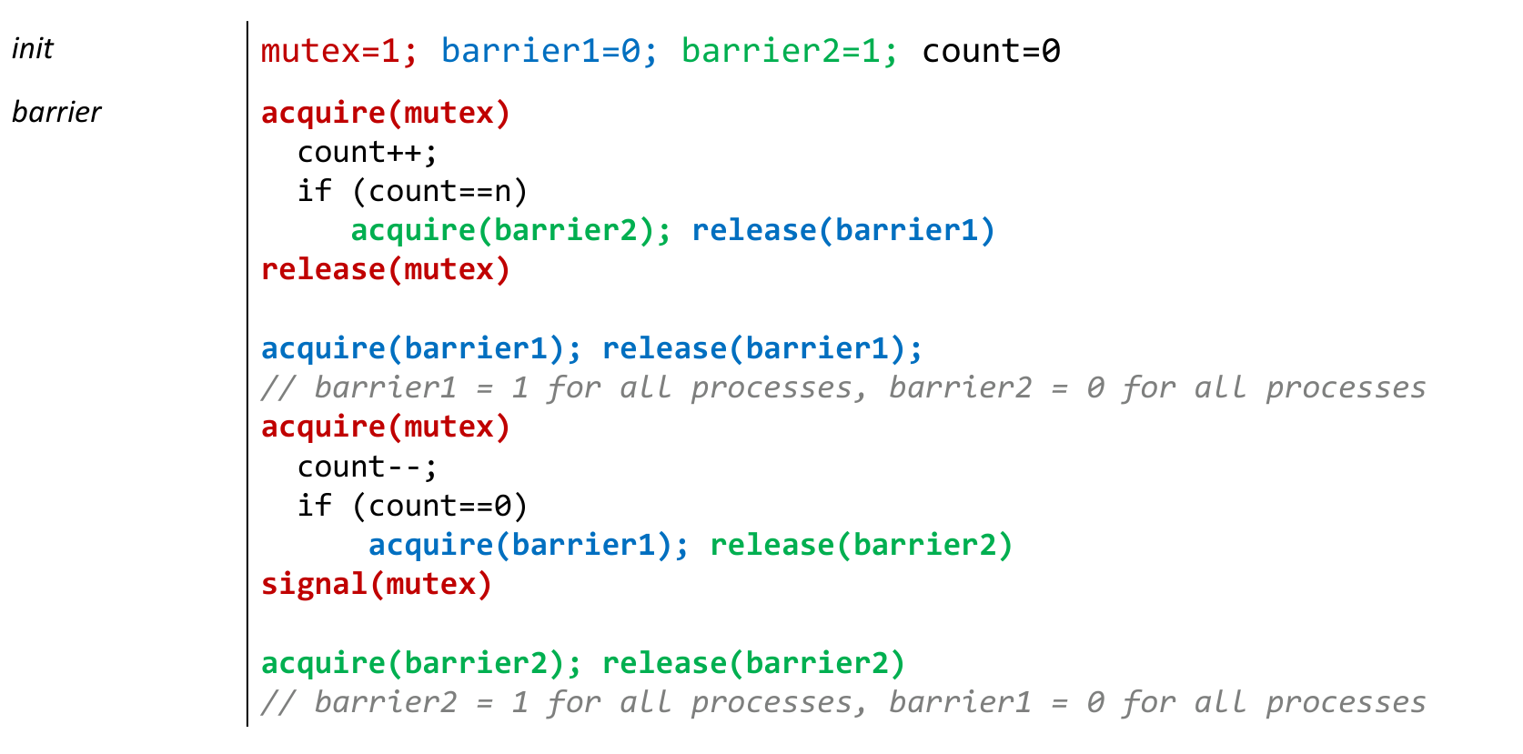 Pi:// === Phase 1: Arrival === acquire(mutex); count++; if (count == n) release(barrier); // Open gate if last release(mutex); // <-- Release mutex EARLIER acquire(barrier); // Wait for gate release(barrier); // Let next thread through (turnstile) // === Phase 2: Reset (Attempt) === acquire(mutex); count--; // PROBLEM: If count becomes 0, should we 'close' the barrier? if (count == 0) acquire(barrier); // Still WRONG! release(mutex);