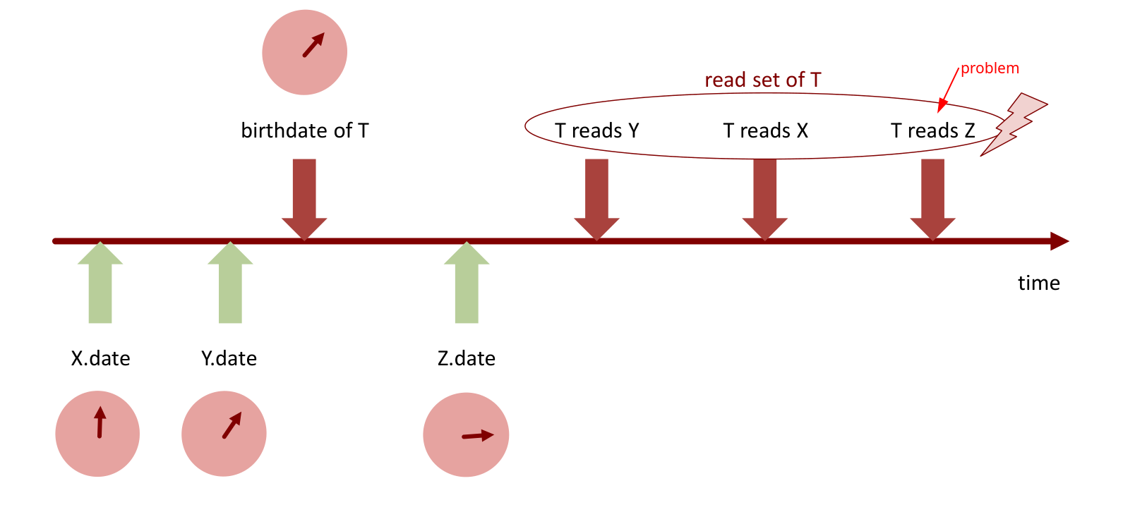 Recall the validation requirement: for a transaction T to commit successfully, all objects it read (in its read-set) must still have timestamps less than or equal to T’s birthdate at the moment of commit validation. This ensures that no conflicting write by another transaction occurred and committed after T started but before T attempts to commit. The timeline shows T reading Y, X, and Z. If Z’s timestamp (Z.date) is updated by another committing transaction to be greater than T’s birthdate before T commits, T must abort upon validation (indicated by the lightning bolt).