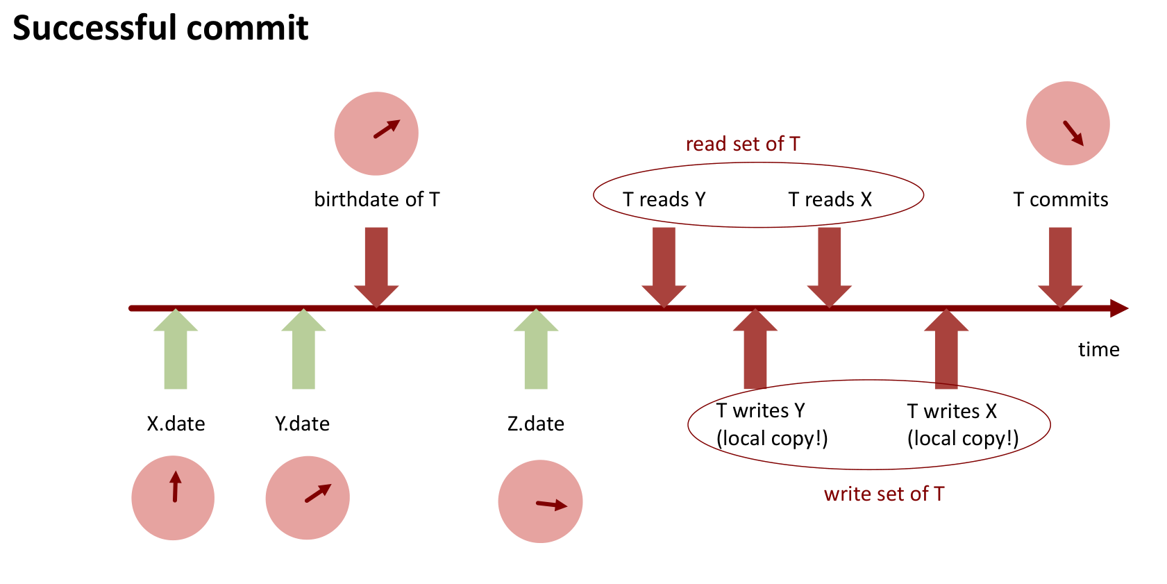 This timeline illustrates a successful commit. Transaction T reads Y and X. It also writes to Y and X (creating local copies in its write-set). At commit time, it locks Y and X, validates their timestamps (which are still ⇐ T’s birthdate), gets a new commit timestamp, writes its local copies back to Y and X with the new timestamp, and releases the locks.