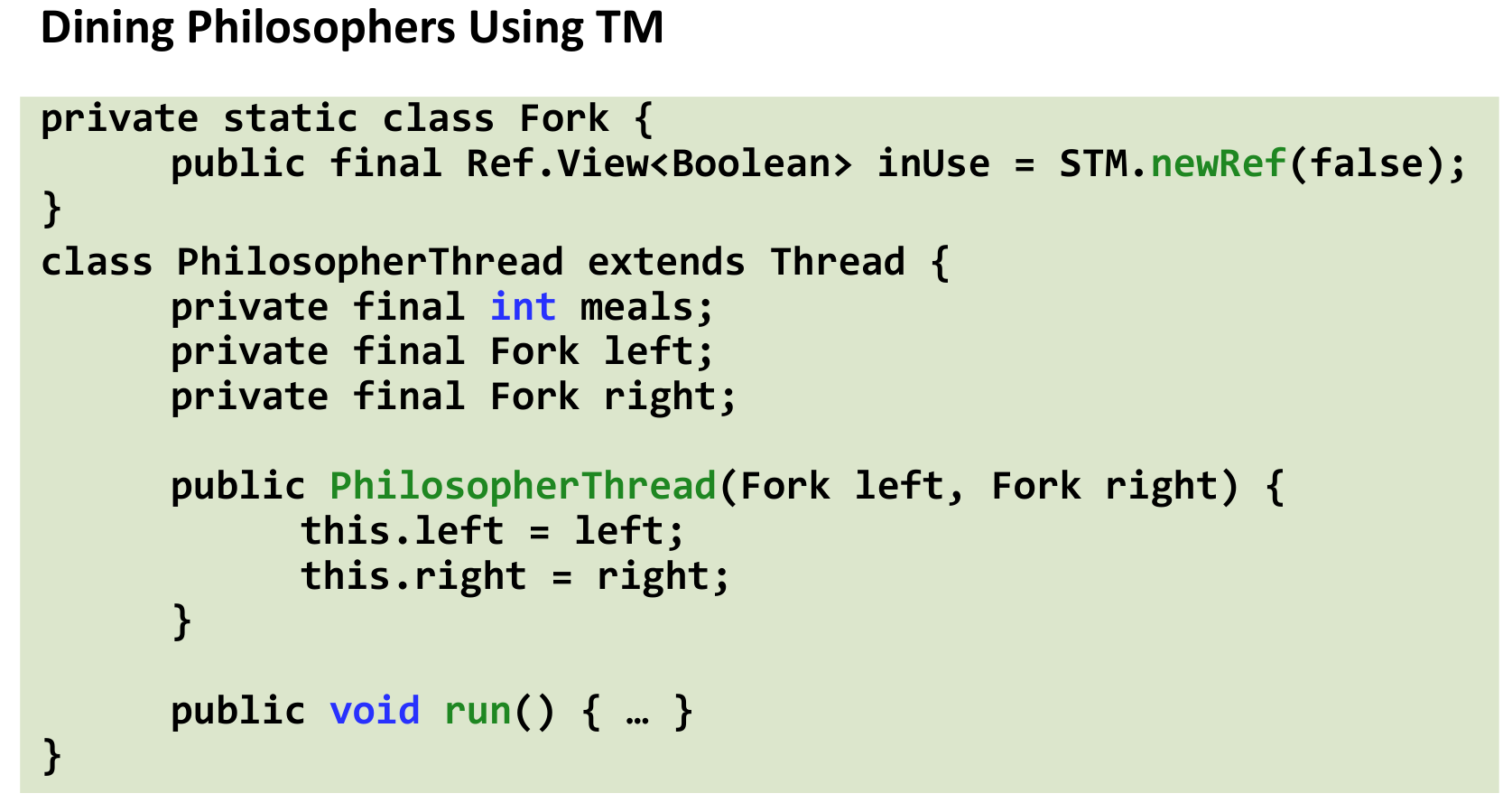 Forkobject contains a transactional referenceRef.View<Boolean>calledinUse, initialized tofalse.STM.newRef(false)creates this transactional variable. - Philosopher State: Each