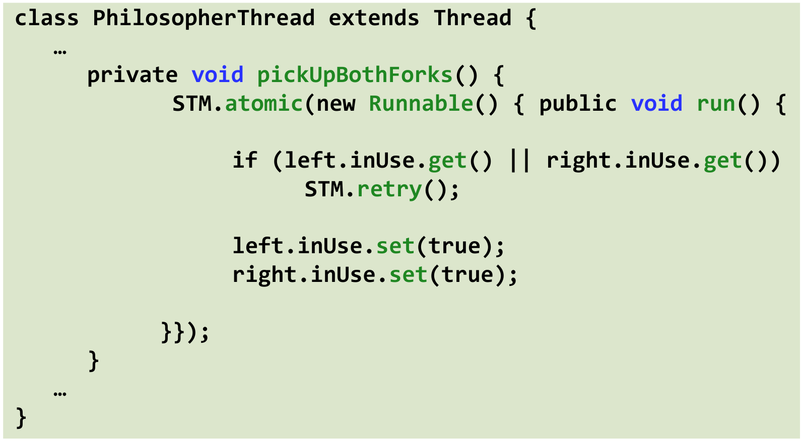 STM.retry(). This aborts the current transaction attempt and puts the philosopher thread to sleep. The STM system will automatically wake and retry the transaction later when one of the variables read in this transaction (i.e.,left.inUseorright.inUse) is modified by another committing transaction (specifically, when a fork is put down). - Acquire: If both forks are free (