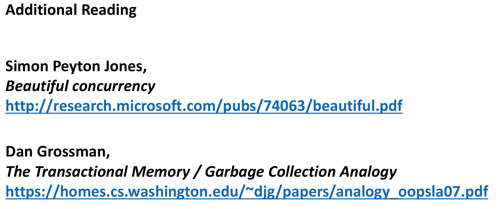 - Summary: Locks are hard; lock-free is often harder. TM attempts to simplify things by abstracting synchronization. However, TM implementations (STM/HTM) are still relatively immature, performance is challenging, and fundamental issues like I/O remain. It has not yet become a mainstream, widely adopted programming model, though it sees use in certain language communities (e.g., Haskell, Clojure) and remains an active research area.