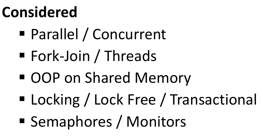 So far, we’ve considered parallel/concurrent execution primarily through threads (fork-join) operating within a shared memory space, using various techniques (locking, lock-free, transactional, semaphores, monitors) to coordinate access to shared mutable state.