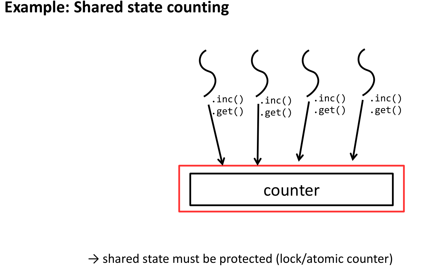 In the shared state model, multiple threads trying to increment a counter need to synchronize access (lock or atomic) to the single shared counter variable.