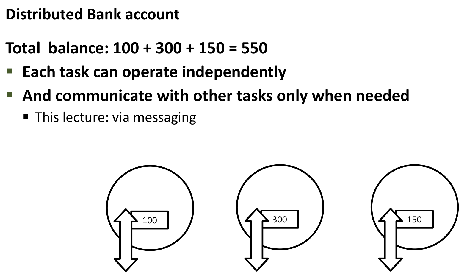 This depicts three tasks, each managing its local balance independently, interacting only via messages (not shown) when needed.