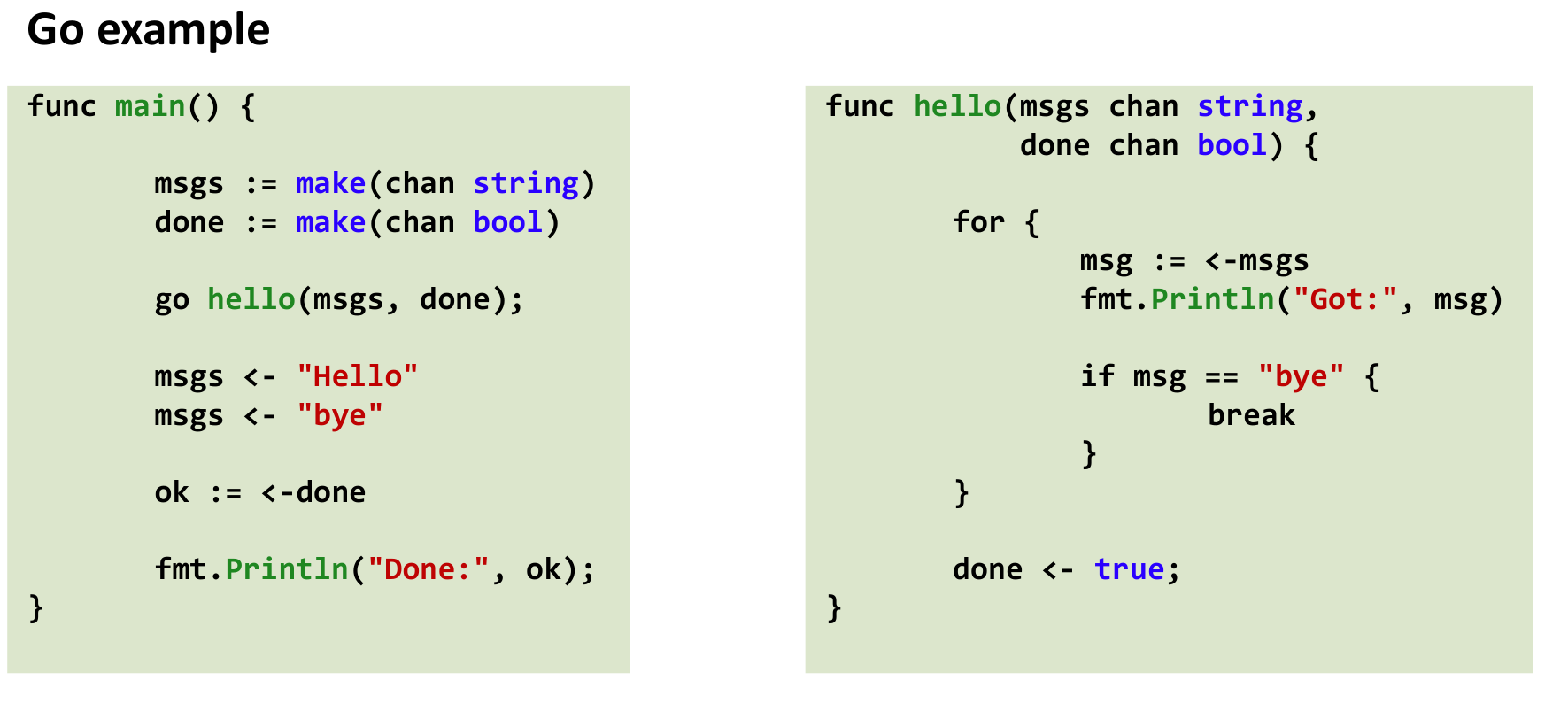 This example shows creating channels, starting a goroutine (go hello(...)), sending messages (msgs <- "Hello"), receiving messages (msg := <-msgs), and synchronizing completion (<-done). The use of synchronous channels dictates the execution flow.