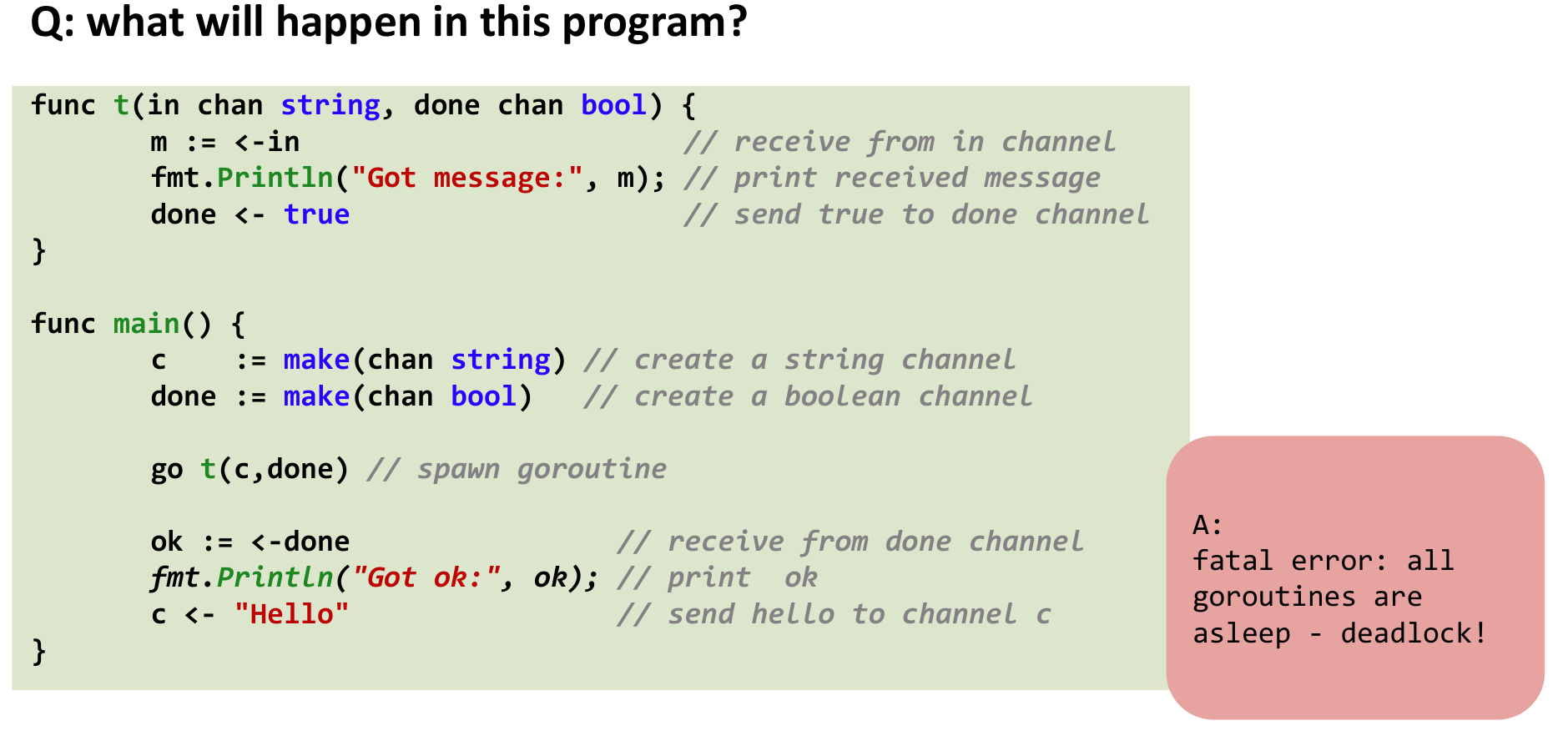This second example demonstrates how misuse of synchronous channels (waiting to send when the receiver is waiting to receive from a different channel) can lead to deadlock.