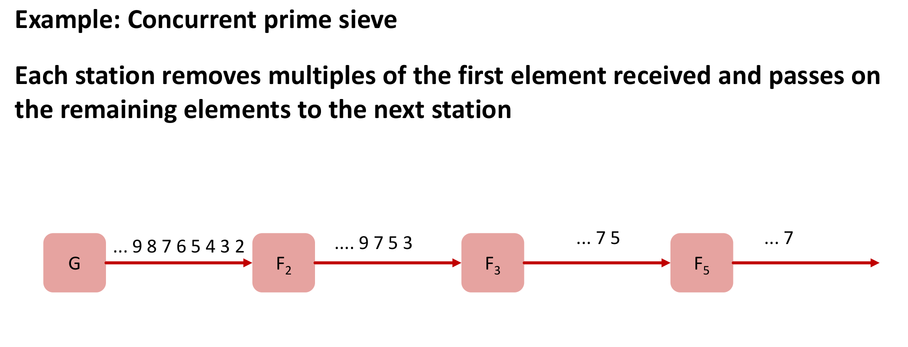 A pipeline is a natural fit for message passing. The concurrent prime sieve works by chaining filter tasks: Generator → Filter(2) → Filter(3) → Filter(5) …
