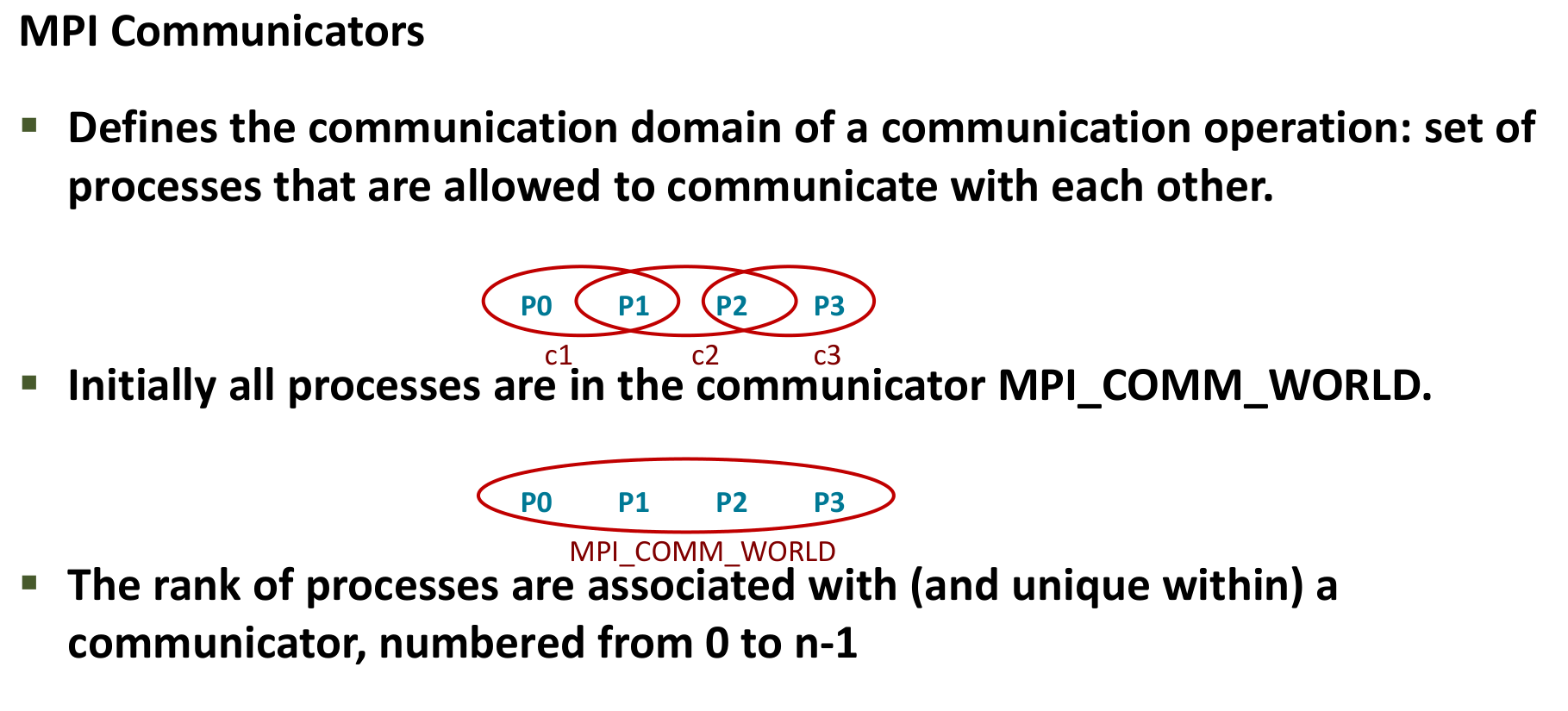 - Communicators: A communicator object defines a communication context, encompassing a specific group of processes that are allowed to communicate with each other using that communicator.