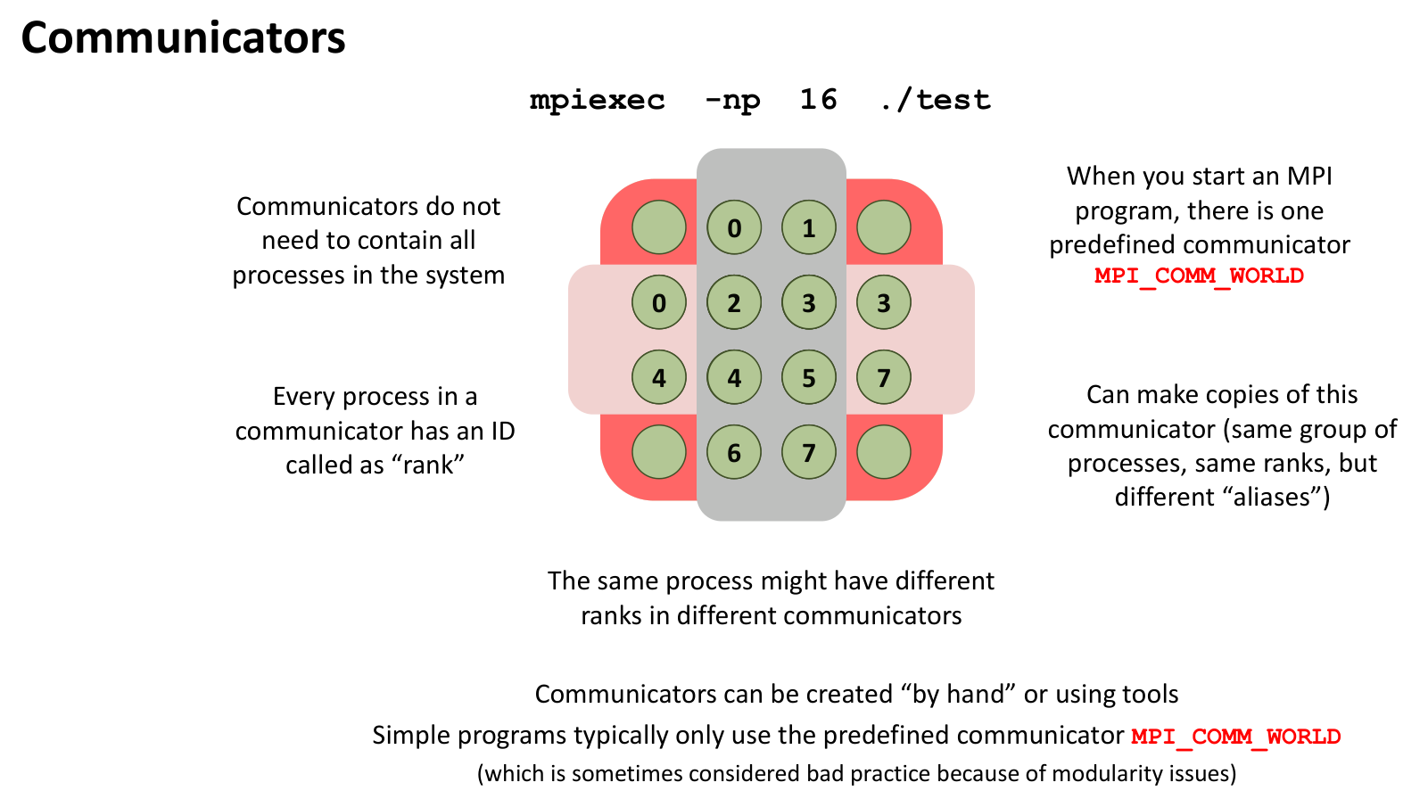 - Processes & Groups: An MPI execution consists of multiple independent processes. Processes can be organized into groups.