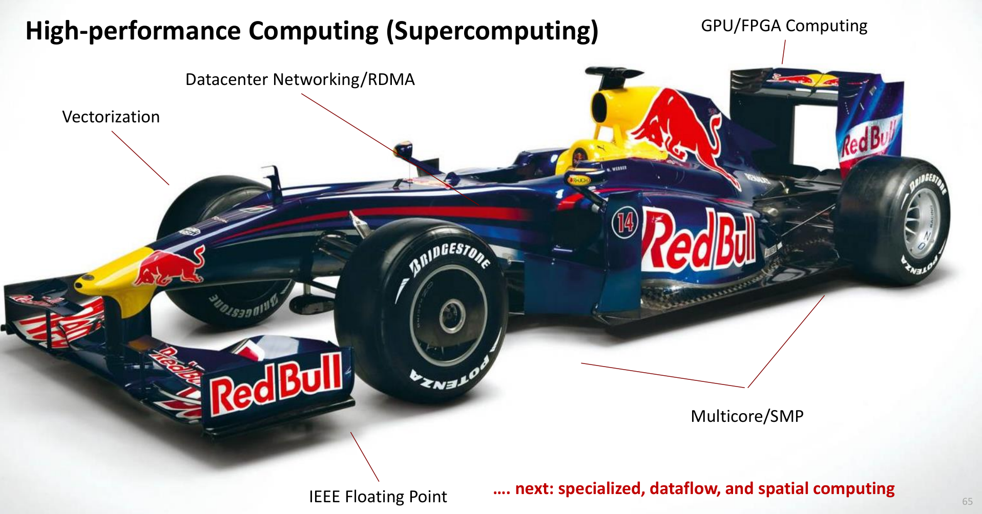 Modern HPC systems are complex integrations of many technologies: fast CPUs/Multicore/SMP, accelerators (GPUs/FPGAs), high-speed networking (RDMA), efficient floating-point units, and sophisticated software stacks, all working together like a high-performance racing car.