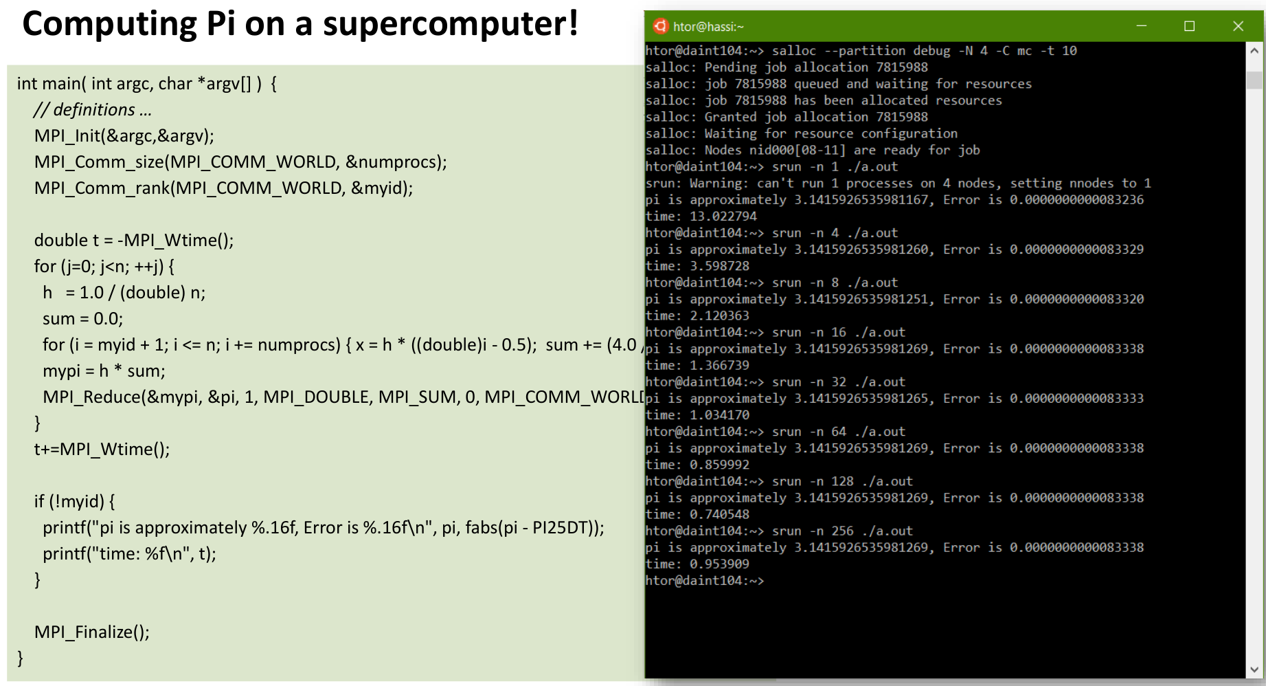 Programming these large machines often involves using MPI to coordinate work across thousands of nodes, as demonstrated by this example of a parallel Pi computation running on a supercomputer, scaling the problem across increasing numbers of processors.