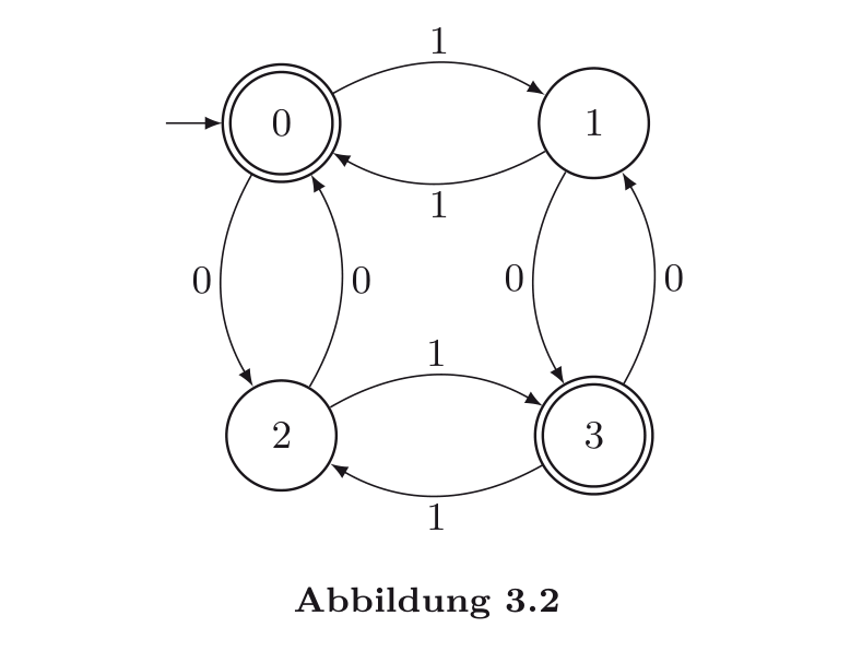 0: if input = 1 then goto 1 else goto 2 1: if input = 1 then goto 0 else goto 3 2: if input = 0 then goto 0 else goto 3 3: if input = 0 then goto 1 else goto 2