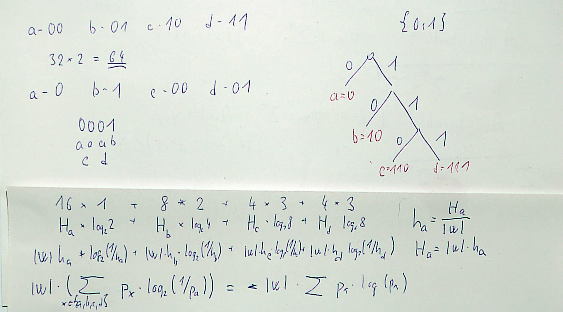 - Encoding: To encode this text in binary, a naive approach uses a fixed length for each letter (e.g., A=00, B=01, C=10, D=11), requiring 2 bits per character.